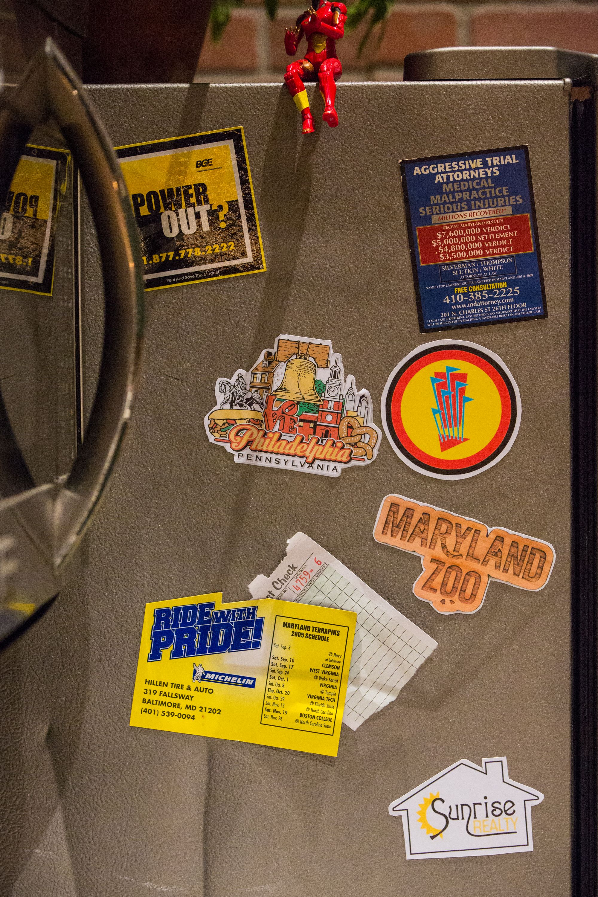 Rachel Erichsen at Baltimore Center Stage put so many details, small and large, into the set designed by Sim Carpenter. She reupholstered a whole chair and built a sofa. And she also made and sourced tiny things, like these magnets that are very Baltimore but also very "we got them for free at the State Fair." I had a long conversation about whether the main characters would have an Orioles calendar and a Ravens magnet on their fridge. The Ravens went; the baseball calendar stayed.