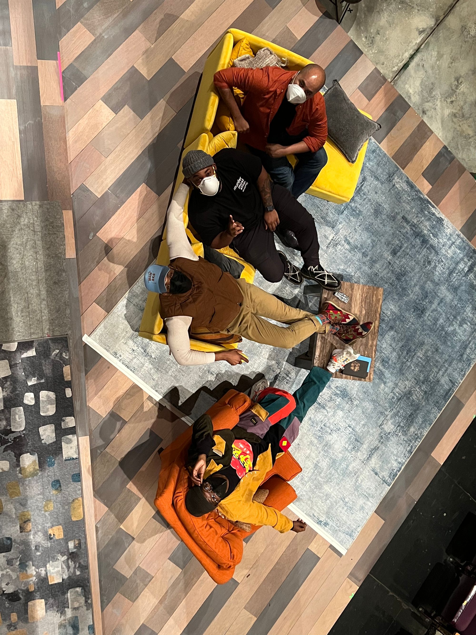Right now, the whole cast is sitting in the middle of the set, gathered around a a couch and a chair, talking and laughing. We're on a hold--the lighting designer is running through different looks, casting them in twilight at moments, and full light, and special spotlights, which makes their casual conversation seem elevated. The sound designer is working the the precise timing for microwave popcorn, so that it works with spoken dialogue and action and supports a series of punchlines. The director and assistant director are working with stage management on how to move everyone off the stage at the end of the scene. I am just here to make offerings, to catch an ad lib that worked really well and throw it into the script, to marvel with a critical eye. And to write this newsletter. Process!