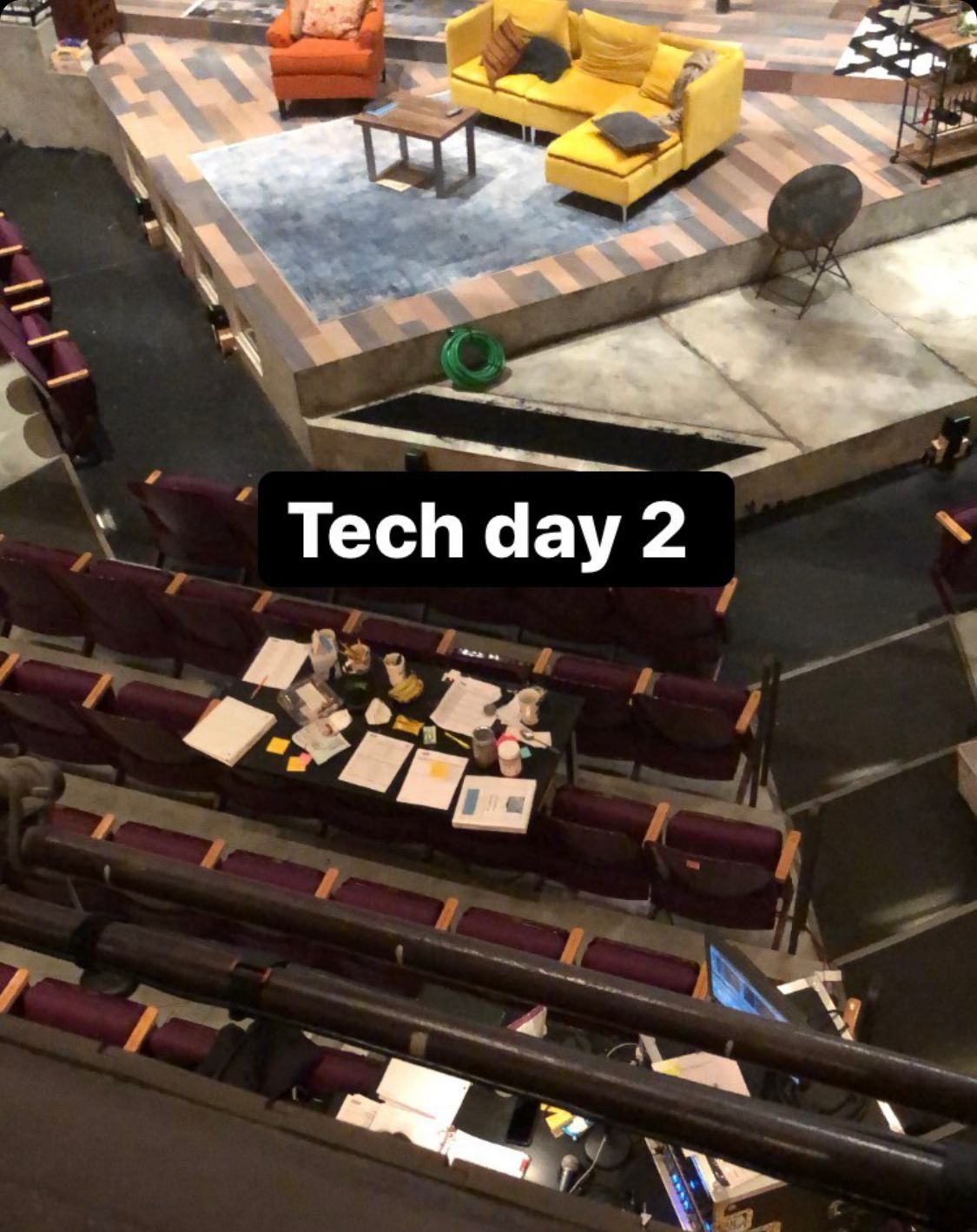 My attention is everywhere during tech. And I find it's different every time. During Backing Track tech, I was tinkering with the script throughout the process. We reworked a climactic moment differently every day. For Folks, I'm doing less script tinkering and I've become hyper focused on all the small details that this world to life. Tracking one character's frequently lost house keys throughout the play; the micro gestures that tell me these people live in this house and with each other; the small accumulation of dirt on a work uniform; the subtle shifts in light that reflect an interior landscape.
