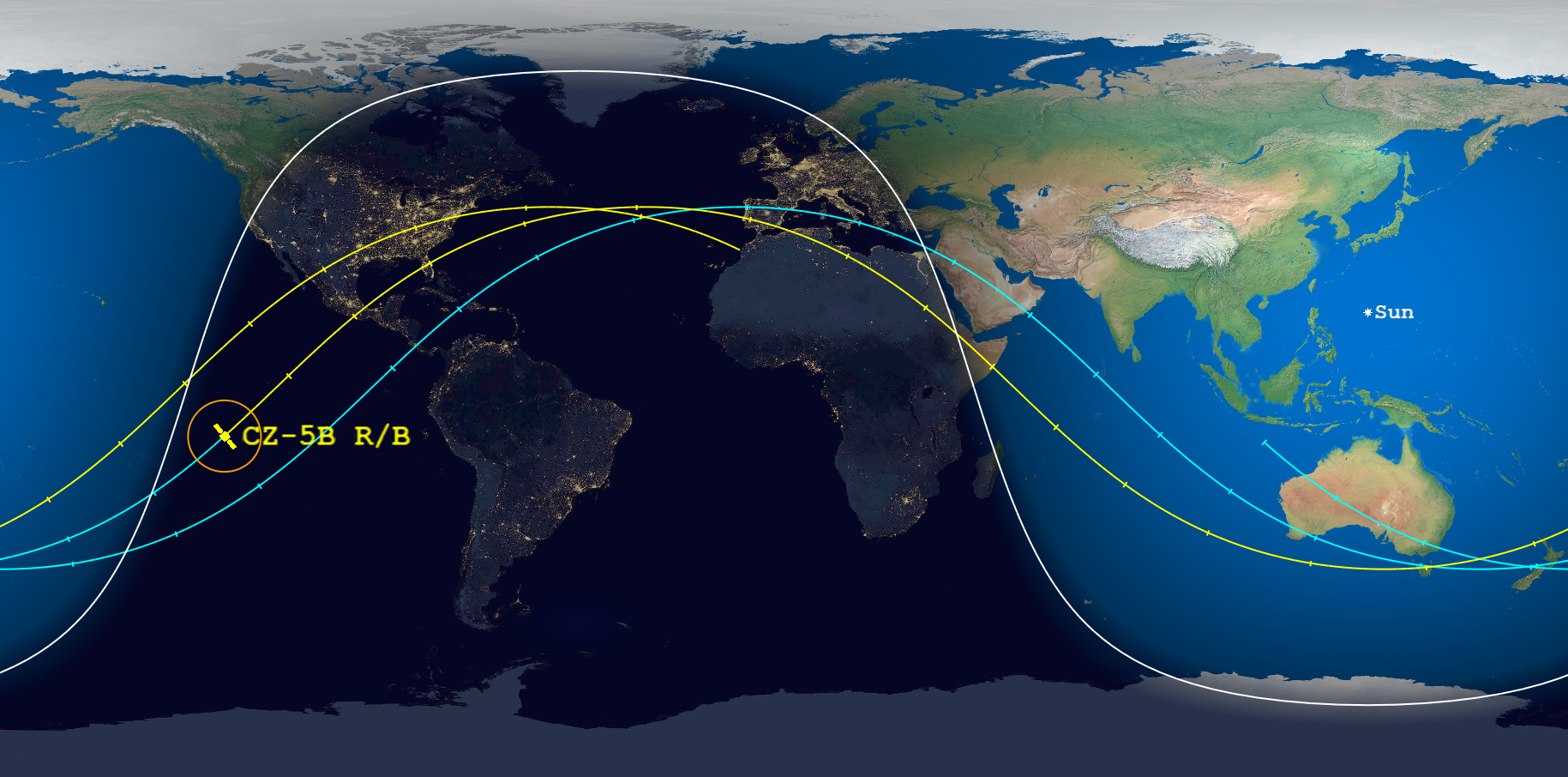 It's wild. Look at this map made by the Aerospace Corporation (a real place!)--the yellow and blue lines indicate places where the rocket could have come down.