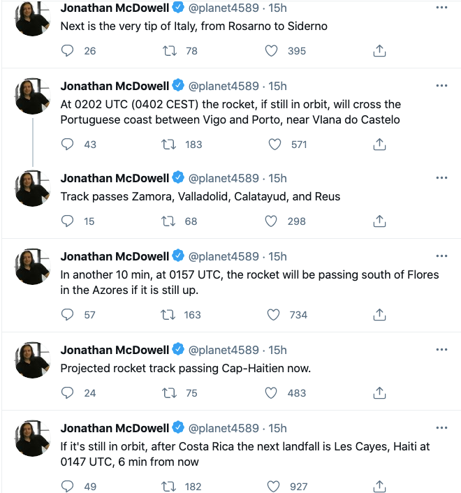 As the evening wore on, astrophysicist Jonathan McDowell started tweeting out minute by minute updates on the rocket's position, so one minute it's over Haiti and the next minute it's over Greece and the next minute it's over New Zealand, and that is high farce.