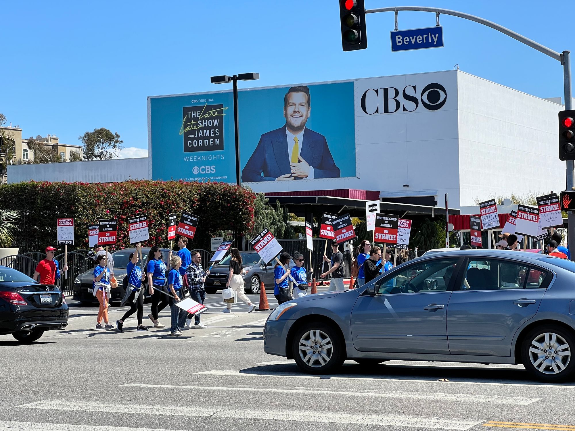 The thing is, though, the day I arrived in LA was also the day that the WGA strike started so I couldn't do any more meetings. While I was a little sad about not being able to find out how tall other people are, I unequivocally support the strike--for many reasons but mostly because I think it's important to work for more than just Box water. And I was excited about the opportunity to actually picket (there's not a lot of picketing happening in Philly, so I had to jump on the opportunity while I had it). I had lunch with a friend and then moseyed over to the nearby CBS TV Studios where there was a picket line circling under the watchful eye of a giant James Corden.