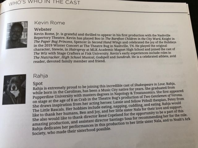 Much like Regina Hall's absurd line reading in Scary Movie, I came away from the excellent production laser focused on one random thing. So, if you've seen Shakespeare (Shay-Kes-Peare) In Love you may remember that part of Will's plans are upended by a petulant young boy who wants to get cast as Juliet but is constantly overlooked. I did not remember this part, nor the fact that it's revealed that the young boy is John Webster, future tragedian with a dark view of society. Webster wrote The Duchess of Malfi and a play called The White Devil, which is also my autobiography. No shade to the kid who played him in the movie 20 years ago but the part just didn't stick in my mind. That was not the case, however, with Nashville Rep's production. The kid playing Webster, at 14-year-old named Kevin Rome, seems to simultaneously be channeling Patti LuPone's Mama Rose, the character Santana from Glee, and possibly Hannibal Lecter in his portrayal and it has, without hyperbole, shifted the entire course of my life. It's such a simple role that doesn't require a lot of an actor beyond background acting and a quick moment of tattling towards the end to complicate the plot. It's maybe 4 minutes of stage time total. Yet somehow, in my memory, this kid was on-stage giving the Roy Cohn opening monologue from Angels in America, for the entire 3 hour running time of the play. The play is only 2 and a half hours long. Where did that extra half hour come from?! ACTING.