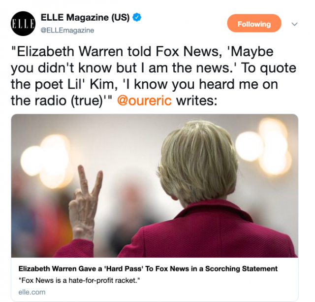 Instead, she concluded by twirling on the haters, reminding Fox News and the world that she's already held 75 town halls and 131 interviews. She's answered 1,100 questions since January (you know she personally has a spreadsheet that she compares with the spreadsheet of the staffer whose job it is to keep track of this.) Elizabeth Warren told Fox News, "Maybe you didn't know but I am the news. To quote the poet Lil' Kim, 'I know you heard me on the radio (true)'
