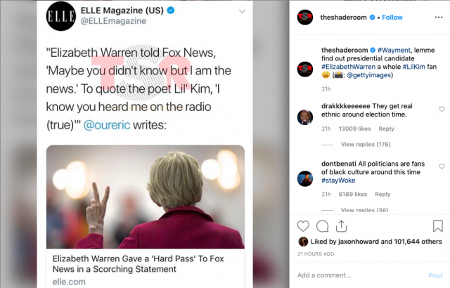 I decided I was going to ignore all the tweets in which people were re-posting my column and talking about how excited they were that Elizabeth Warren is a Lil' Kim fan. Truth has no place on the internet. But then the very popular blog The Shade Room got in on the act and posted this to their 15.4 million followers: