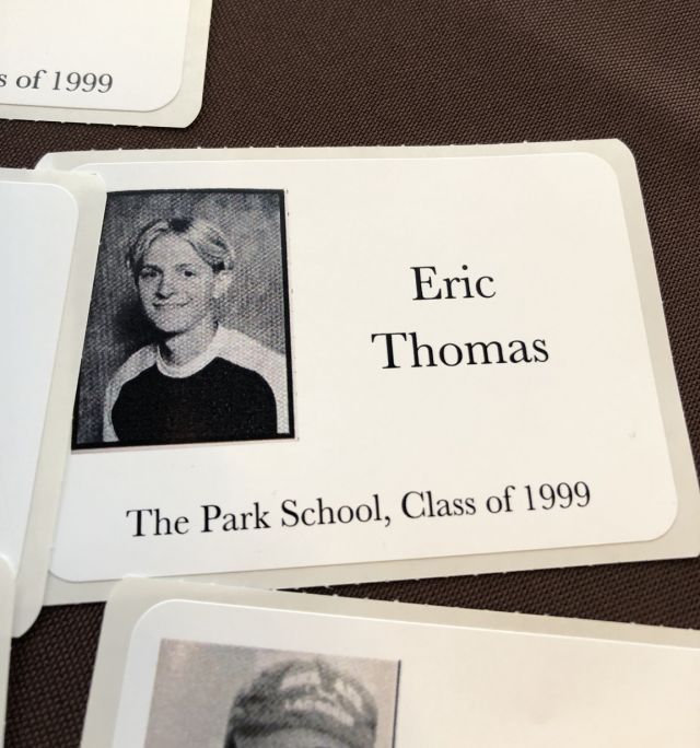 I don't want to alarm you but that is not me. That's another kid named Eric from our class. The name tag with his full name also had his face on it. So, two times this face, zero times my face. (Also, an interesting note for future biographers: I did not start using my first initial until the day of my high school graduation! An affectation!) I appreciate the hard work of everyone at the alumni office and I have enjoyed collaborating with them to do speeches and presentations on campus in the past. But, I must say in total seriousness that someone is definitely going to jail for this.
