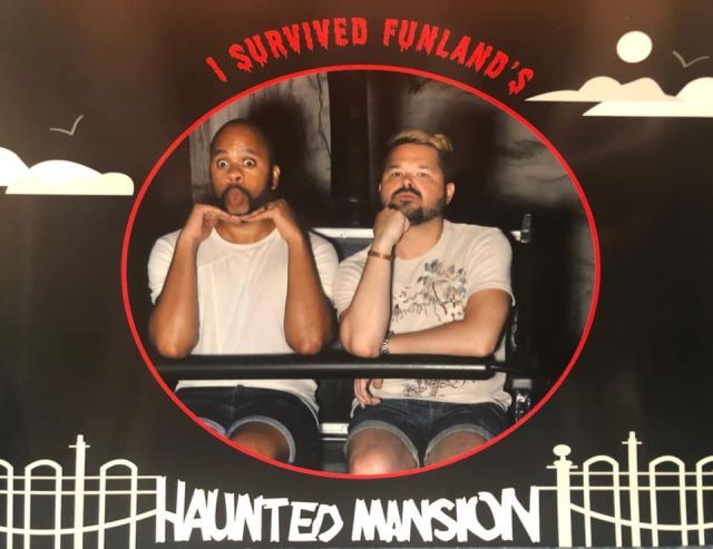 But with $20 worth of quarters and literally no agenda, I was a KING. I was a Medici! I was a character on Succession. I paused my playing briefly to ride the Haunted Mansion ride with my friend and soul twin Chris Newcomer. We both decided without even having to consult each other that we would pose for the "surprise" photo the entire ride. I cannot describe the ride to you because I was too busy being professionally committed to a bit. The photo was $7. Worth every penny!