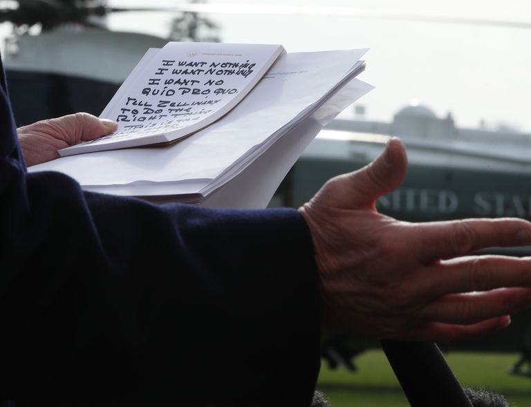 Trump seized on the quote and did what any rational, even-tempered, innocent person would do in this scenario: he took notes on his own quoted statement in an a Sharpie the size of George Kent's water bottle and then went outside, fired up a helicopter, and then shouted a statement at reporters. This is, by the way, the psychic opposite of whispering in a well, if you're building a spectrum of quixotic public declarations.