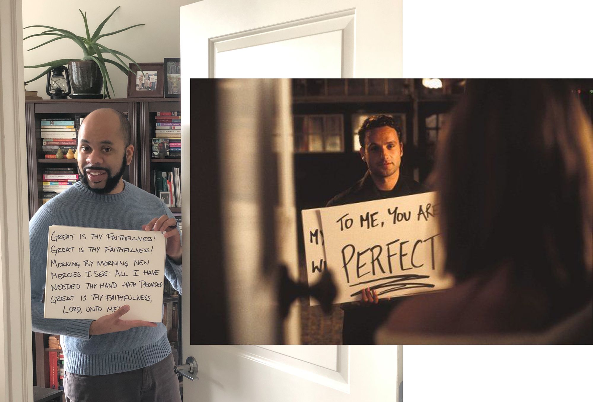 If you tuned into the FB Live broadcast this morning, however, you saw a completely different scene. First of all, I did not make an appearance (they couldn’t come to an agreement with my agents). I did make cue cards to hold up to the screen for the lyrics to the hymns, so my hands made a cameo and I got to do my best impression of Andrew Lincoln wooing Keira Knightly in Love, Actually. (BUT NOT A BAD PERSON WHO SHOULD NOT BE DOING THIS BAD THING!)