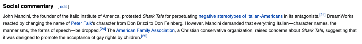 Perhaps the most chaotic part of this Shark Tale rabbit hole that I dug myself into with a shovel (??) I purchased myself is the “Social commentary” section from the movie’s wikipedia page.