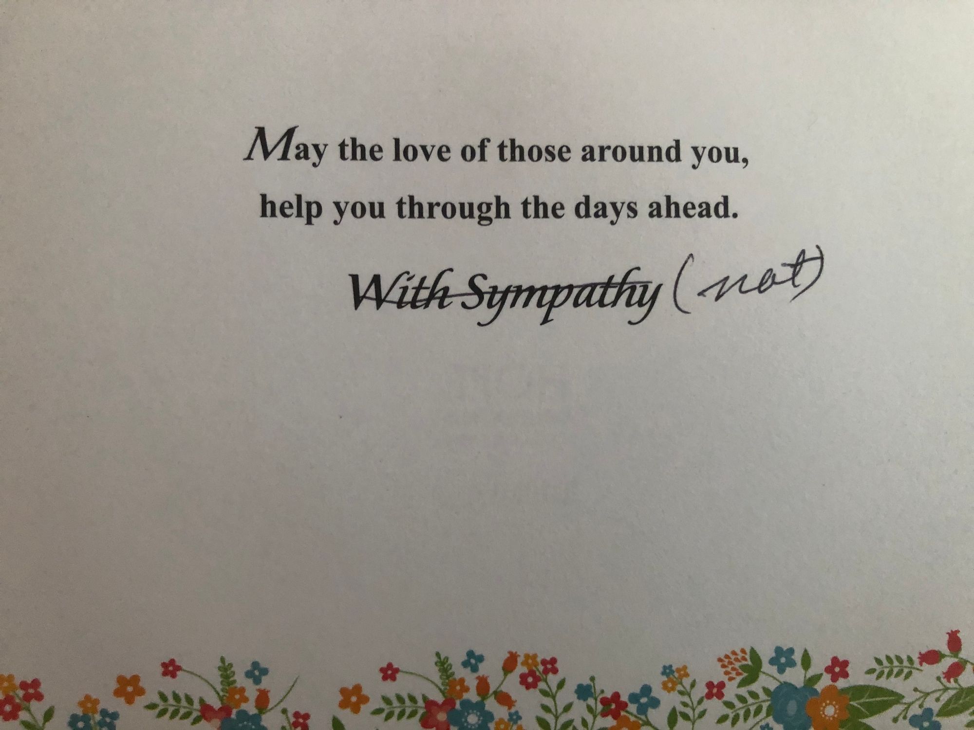 This is the best card I have ever received and it will never go in a drawer. She explained in her note that she hoped we don’t mind a repurposed sympathy card because it’s all she had at the moment. She an older adult and lives in a retirement community, so it’s not safe to be making a lot of unnecessary trips. Which is how we got “With sympathy (not)” which is a phrase that makes me giggle every time I read it. I love the idea of housewarming well-wishes being the opposite of sympathy. I love a parenthetical (not) in a sincere greeting card! I also love that the other message from the sympathy card is still applicable. Yes, I would like the love of those around me to help me in the days ahead, thank you very much.