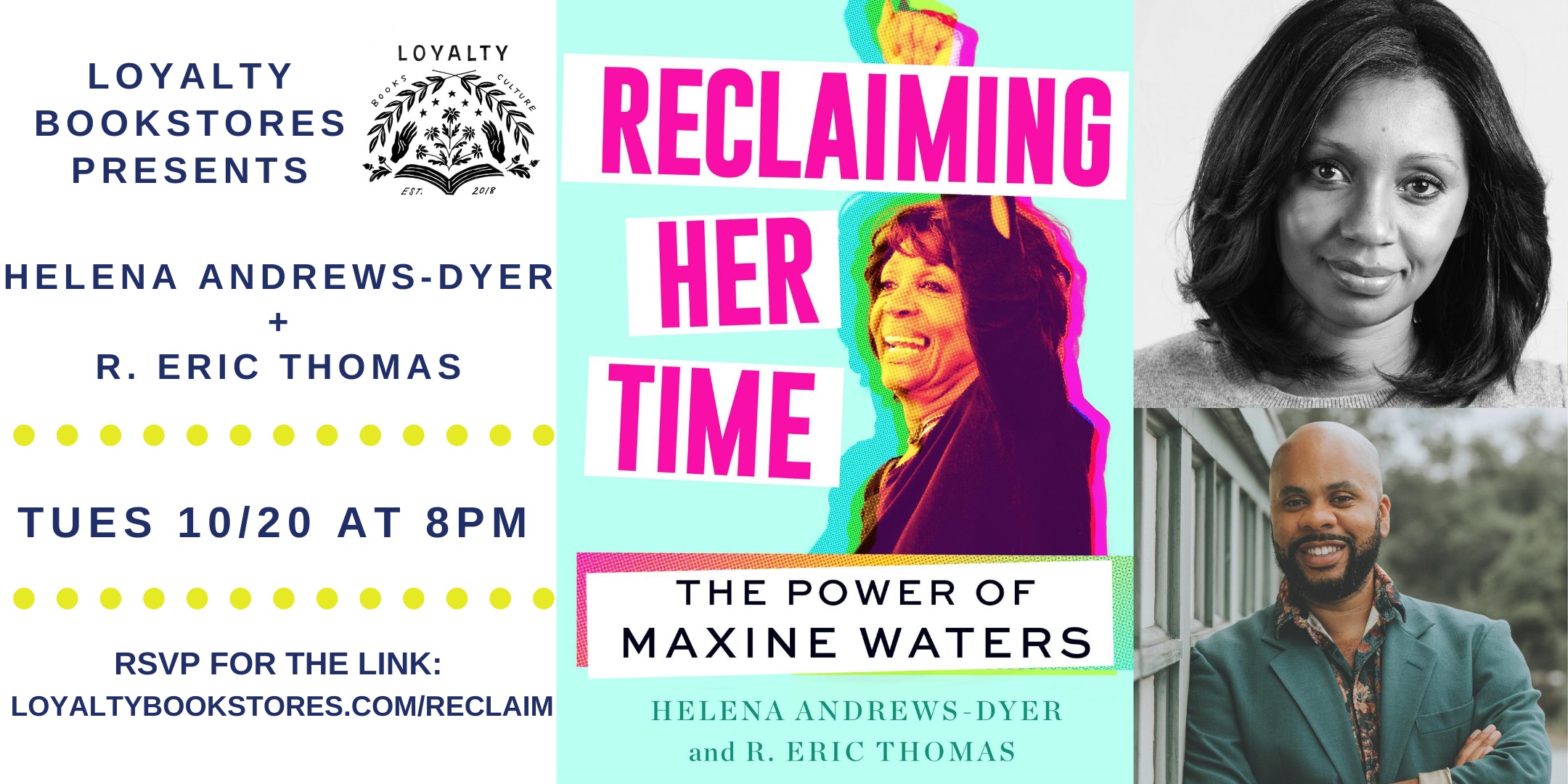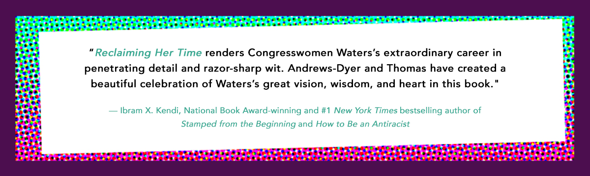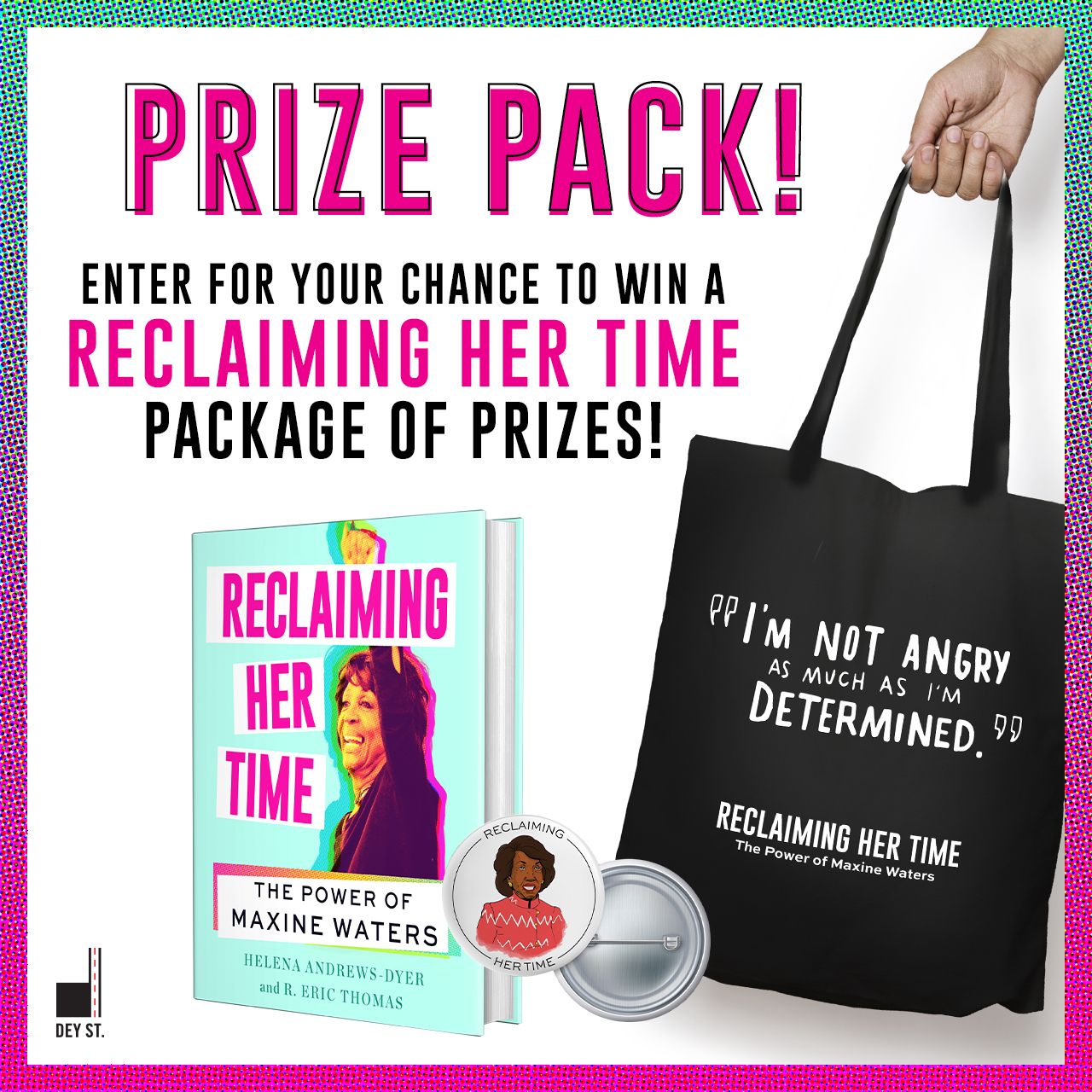 I’m hosting a giveaway for a Reclaiming Her Time prize pack, featuring a copy of the book, a tote bag, and assorted other custom goodies, on my Twitter and on my Facebook page. All you have to enter do is tag someone who loves Rep. Waters on the FB post or retweet the tweet! We’re picking a winner on Tuesday, so enter by Monday, October 19, 2020.