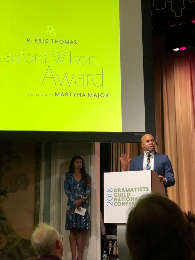 So, when I tell you that last night I spent the evening in a room full of celebrities, I am not humble-bragging but rather describing a delightful and yet very confusing series of interactions with a bunch of complete strangers I know very well. I'm part of the Dramatists Guild, a trade association representing the interests of playwrights, composers, lyricists, and other people who write for the stage. Pretty much every playwright you've heard of is a member, and for good reason--artists need people to advocate for their opportunities and their rights and often lack the time or resources to do so. The DG has reps across the country who help foster community and a home office in New York that offers classes, provides legal consultation, and, once a year, holds a conference. I went this year because I'm a member and because (brushes dust off of the deeply buried lede) I won a very prestigious award from the Dramatists Guild.