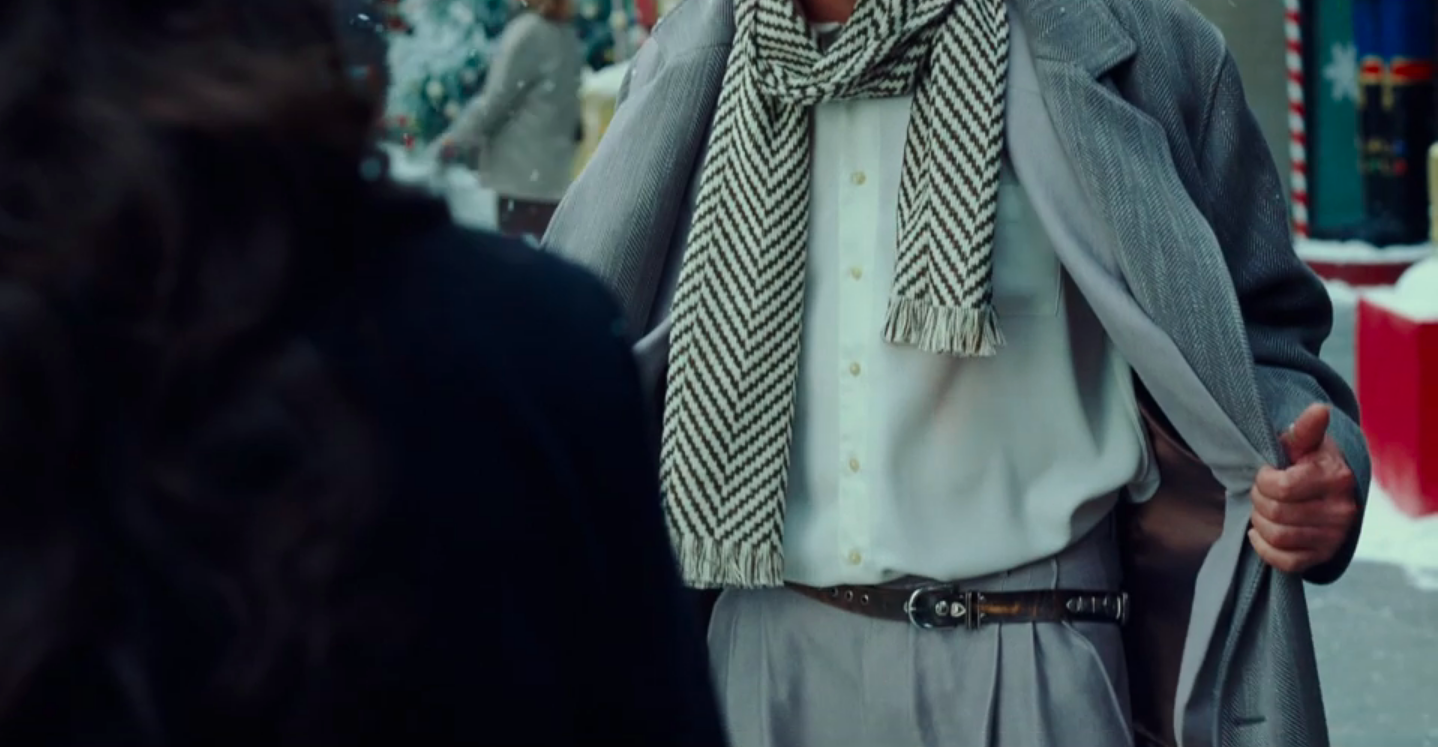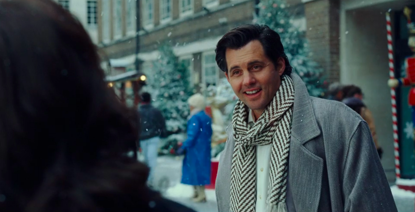 Like any other heroine of a Hallmark Christmas movie, she smiles beatifically, gets gently snowed on, and face acts lightly. And then she has a meet-cute with REAL Fake Steve Trevor, now back in his body and WEARING THE DERANGED OUTFIT.