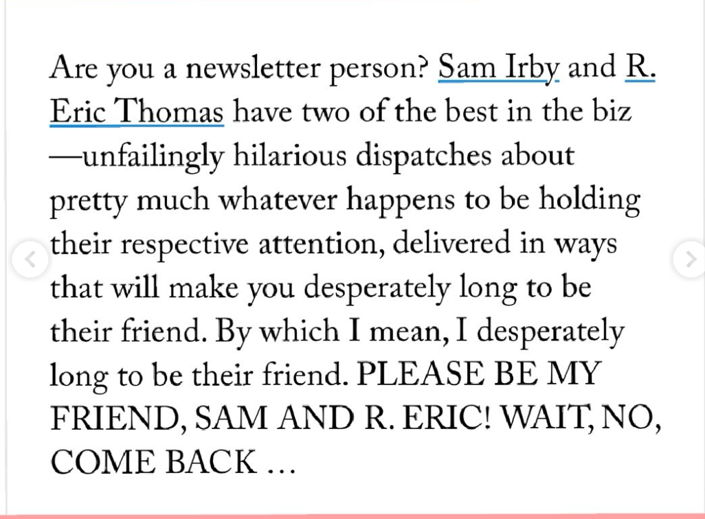 And to be mentioned in the same sentence as SAMANTHA IRBY?! The preeminent newsletterer. (Here's where I segue into my impression of that one video of Oprah talking about Gayle.) She is the newsletterer I never had. The humorist everybody would want. I don't know a better writer. I DON'T 👏 KNOW 👏 A BETTER WRITER.