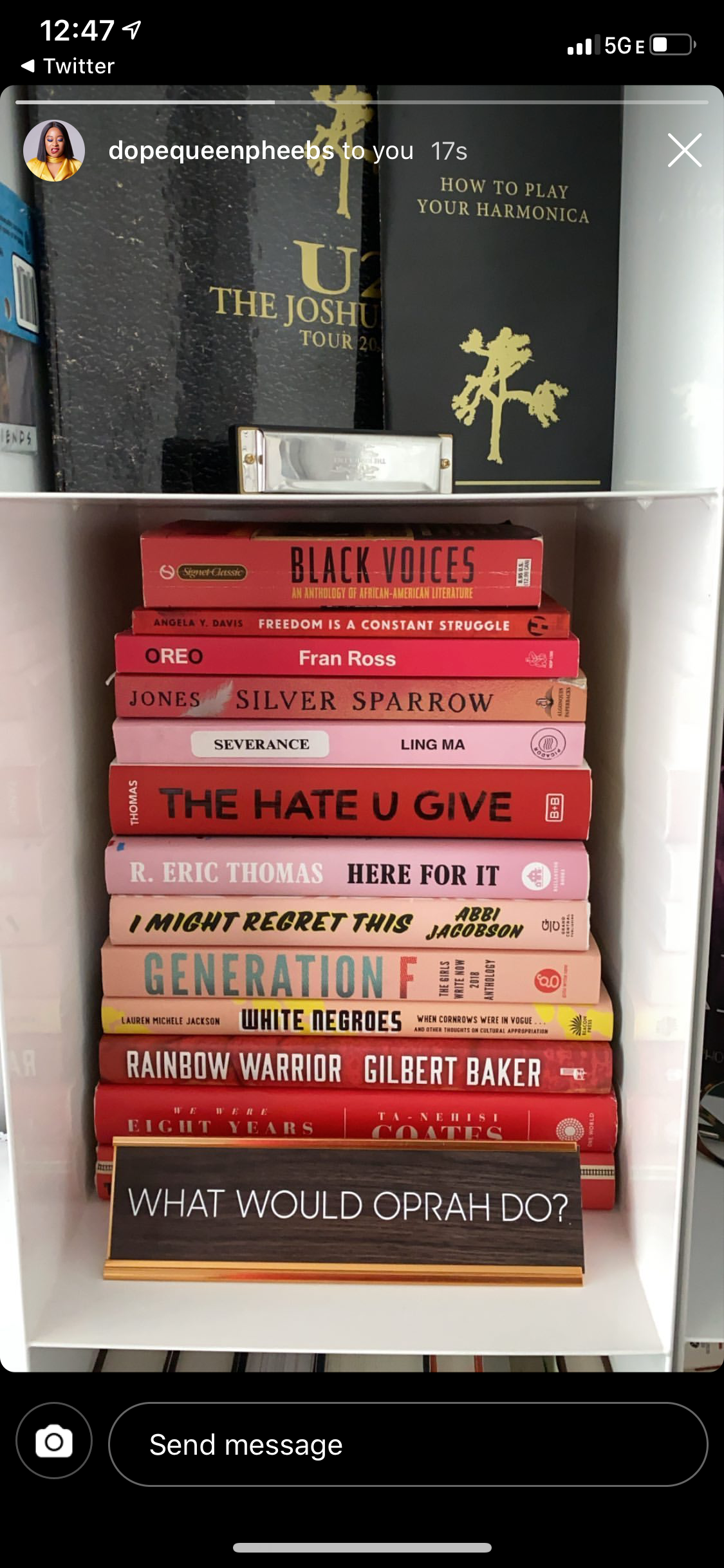 I laughed so hard I woke David up. I texted back “Honey what in the Rorschach test is this?” She was like “It’s clearer on my TV.” I was like “Sure, maybe!” But my mom was adamant that it was my book over Phoebe’s shoulder. A mother knows. So, then I had to find the video of the Tonight Show the next day because I don’t have cable (I’m not too good for it; I’m just cheap) and I had to admit, it did look like my book when you were looking at it right on screen and not on a photo of a screen. So, then I DM’d Phoebe Robinson out of the blue and was like “My mother thinks she saw my book behind you on The Tonight Show and maybe it was or maybe it wasn’t but we both really like you so. HI!” And Phoebe actually wrote back and sent a photo of her bookshelf!
