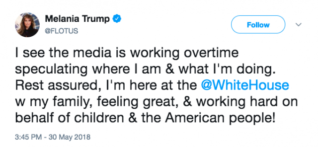 Honey, what is going on with Melania?! She's been out of the public eye for, like, a fortnight and everyone's like, "She gone, girl. She living in the woods with dyed hair under an assumed name. She hitch-hiked to Sacramento with a truck driver played by Cherry Jones. She Ferris Bueller'd herself. There's a mannequin in the bed in the Robin Wright suite in the East Wing. She OUT." It would seem that Melania is "missing." But then "Melania" tweets the most Trump-ass thing I've ever seen, taking "the media" to task for "working overtime" to suss out the real story.