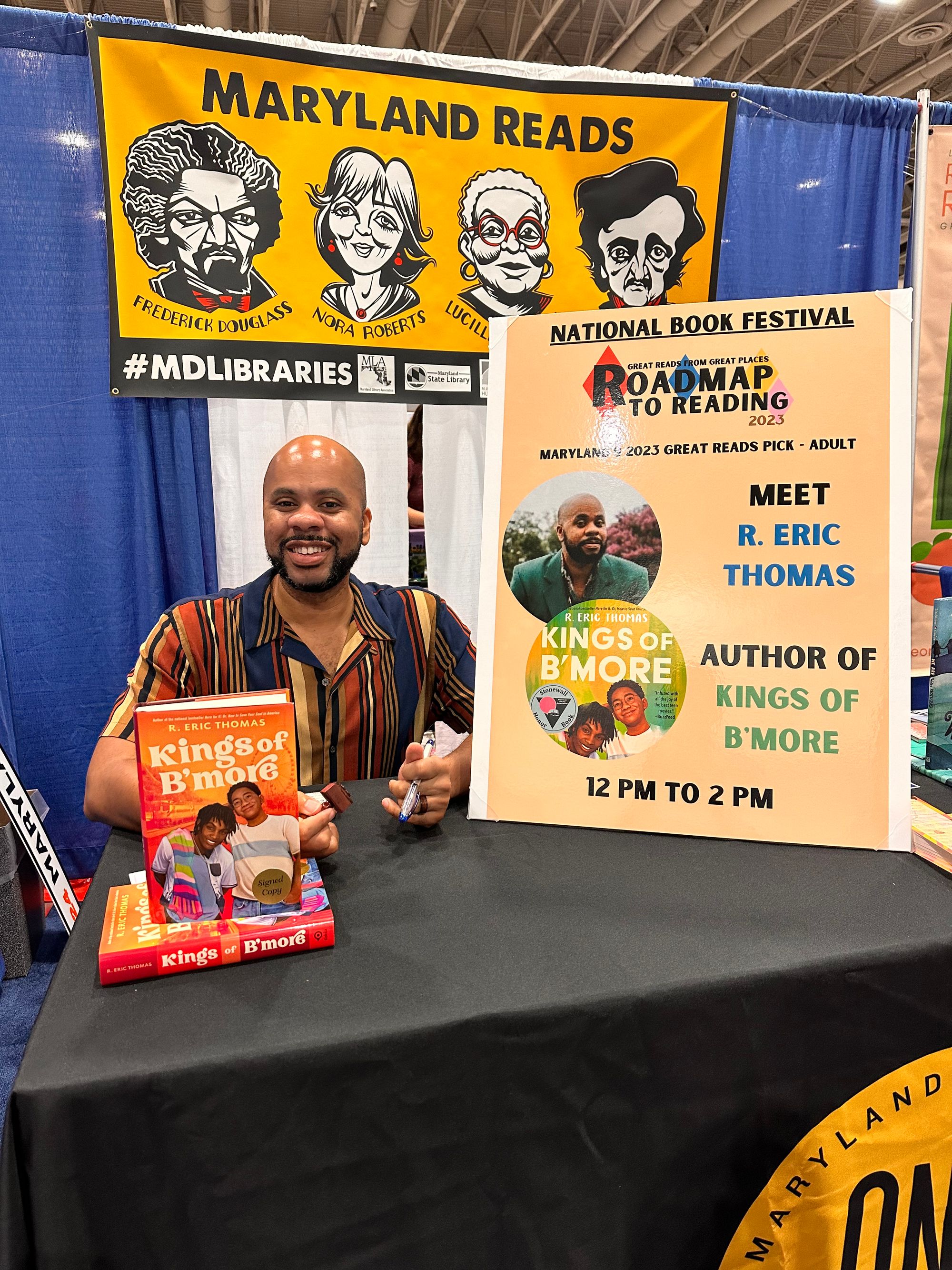 On Saturday, I went down to the National Book Festival to sign copies of my YA novel Kings of B'more. Maryland Humanities and the Maryland Center for the Book had chosen Kings as one of two books to represent the state in "Great Reads from Great Places", a section of a huge room in the DC Convention Center where 56 states and territories were each given a table. They had me come sit at the table from 12-2pm and they'd made a very big, lovely sign to tell people to come by and see me.