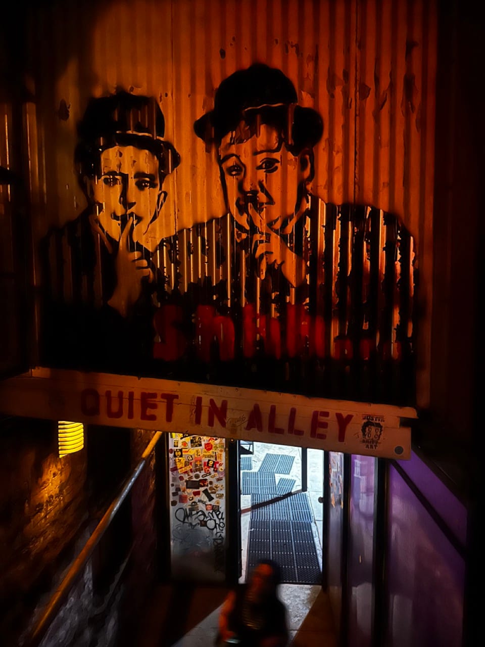 Walking down the block, we'd passed a staircase the led to a dark alley under a building. The staircase had a metal gate with what looked like a handmade poster attached to it.