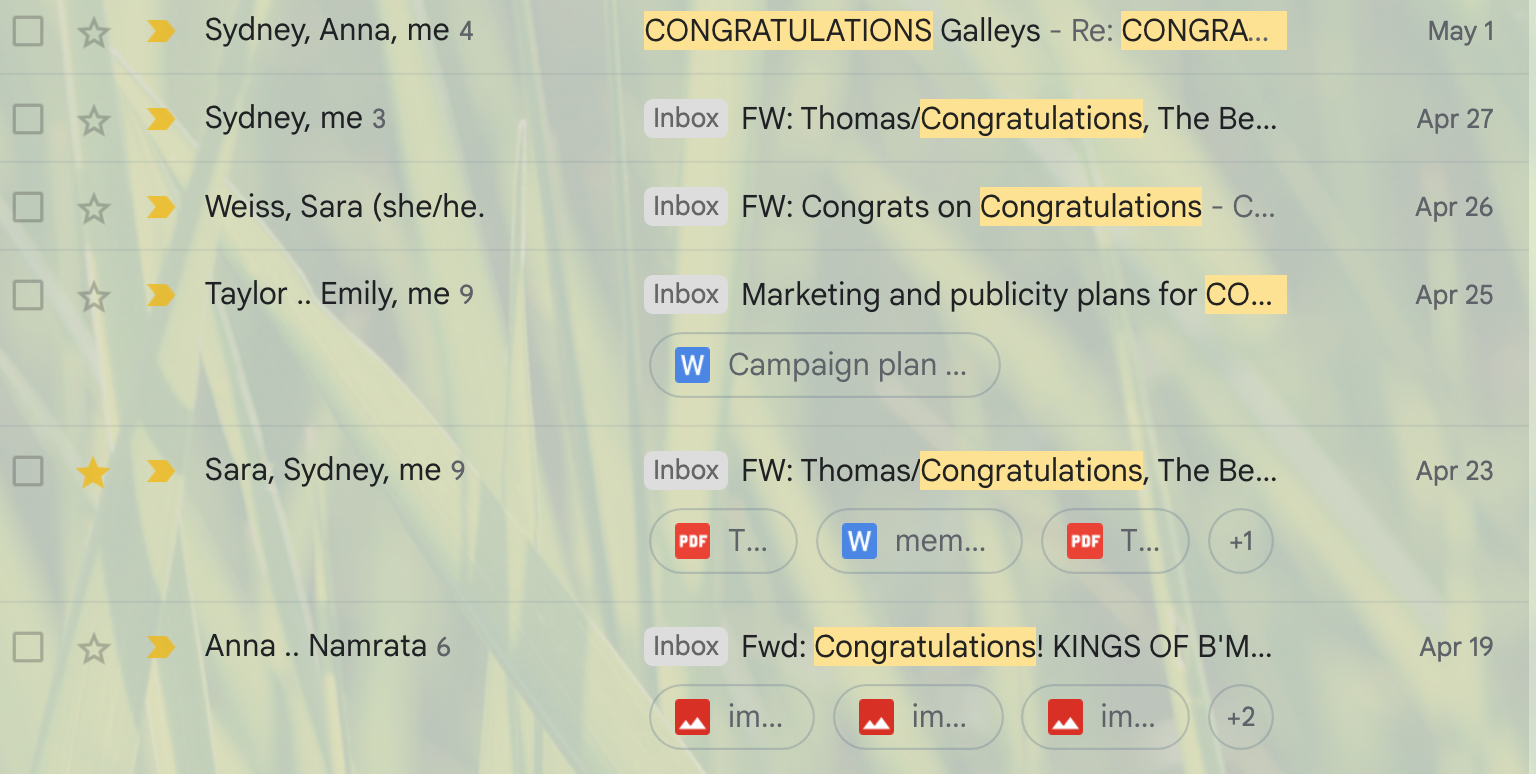 A hack to this system, I've found, is to begin the title of a book with the word "Congratulations" because every e-mail I get about my new book seems like simply wonderful news. My inbox is full of things I need to do, but it looks like I keep winning the Publisher's Clearing House sweepstakes. And isn't that fun?!