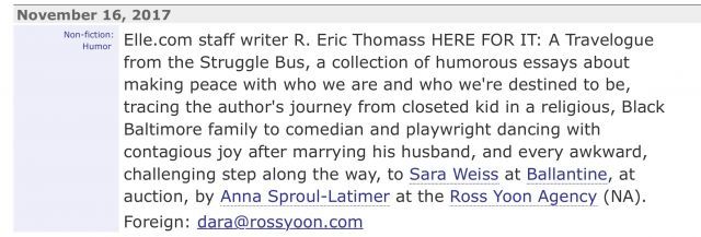 A: Girl, I know! My extraordinary agent Anna Sproul-Latimer and I have been working on a proposal for a non-fiction book of essays for months and it was purchased by Sara Weiss at Ballantine, an imprint of Random House.