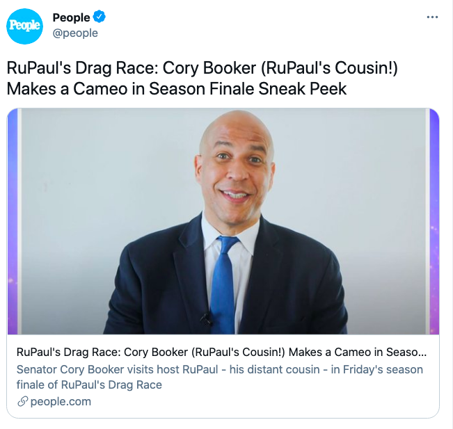 No shade, but I've written a few columns about Senator Cory Booker and I think he seems like a really nice person but every time it was always kind of a stretch to pull the piece together because nice doesn't always translate into "ripe for comedy." Even the piece I wrote about him dating Rosario Dawson was sort of like "well, I hope everyone likes Rent references because that's what I have for you." One time I think I was supposed to write about Booker giving a speech during a Senate hearing and I ended up writing 1,000 words about then-Senator Kamala Harris' eyebrow. That's Hollywood, baby! Anyway, I am so mad that I am just now learning that Cory Booker and RuPaul Charles are cousins! Like, this is the information you lead with. You say "Hello, I am dating the star of Josie and the Pussycats and I have a family tree with mighty roots in the soil of charisma, uniqueness, nerve, and talent. All this would lead you to believe that I have probably met Alan Cumming. Also, I'm a U.S. Senator and ran for president." Again, no shade to him. But let's not bury the lede! If my cousin was the host of Drag Race this newsletter would be called "Queen's Cousin Has a Thot." No shade to my actual cousins, who are great but do not have VH1 shows as far as I know. come to think of it, though, one of them actually looks like Cory Booker so lemme go hop on 23andMe real quick and see if I have to change the name of this newsletter.