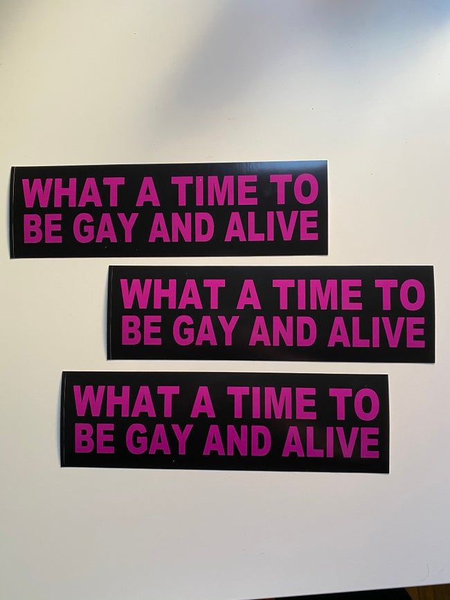 The first thing I saw when I pulled into the parking lot of my local vaccine emporium was a car with a bumper sticker that read "What a time to be gay and alive" which felt very specific but could not have been more applicable given the circumstances. "This is a sign," I screamed as I struggled to turn down the radio and grab my phone to take a photo whilst also trying to maintain a speed at which the cars behind me (also alive, possibly queer, tbd) would not honk at me. There was a lot going on. I really want to show you the absolutely deranged, blurry, Big Foot sighting pics I took but alas the person's other bumper stickers and license plate are visible and I think we all know that I do not possess the technical skill to blur them out so just use your imagination.